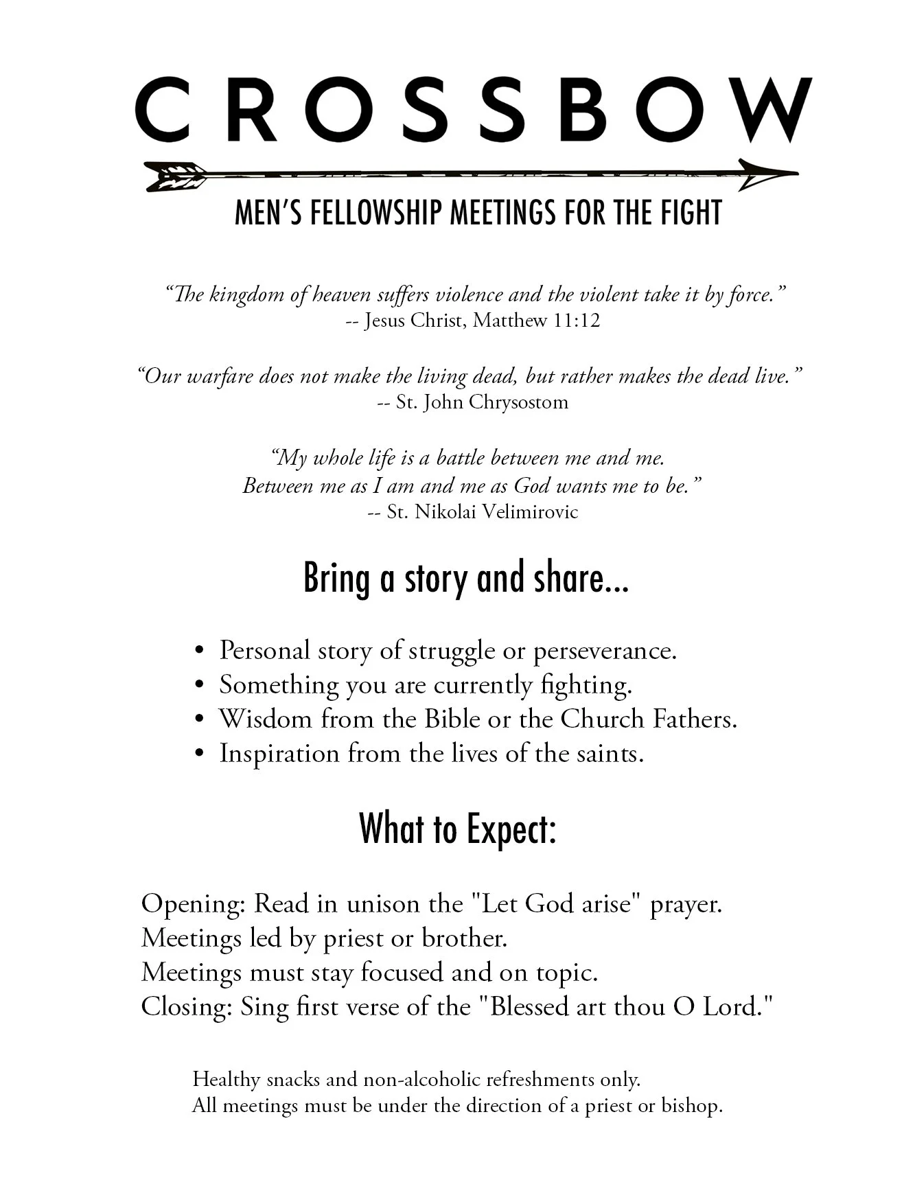 Crossbow meetings are for those who are struggling, and trying to fight the passions. It is for who desire to have a community of support because, as it says in the book of Proverbs, “Where no counsel is, people fall: but in the multitude of counsellors there is safety” (Proverbs 11:14).